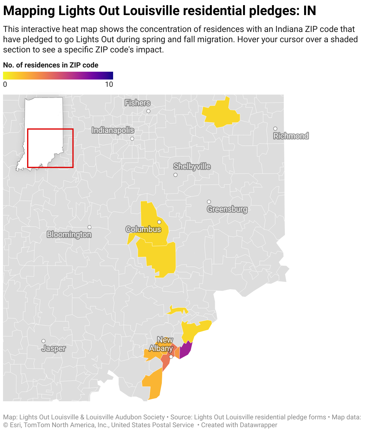 The below maps show how many residences in each Kentucky and Indiana ZIP code have committed to saving migrator birds by signing the Lights Out Louisville pledge form.